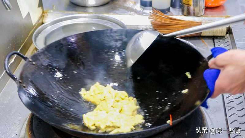 加入食盐,鸡粉,白糖各适量,倒入控油后的鸡蛋,用勺子敲开大块的鸡蛋,快速翻炒片刻,化开所有调料。开大火爆炒十秒钟,美味即成。