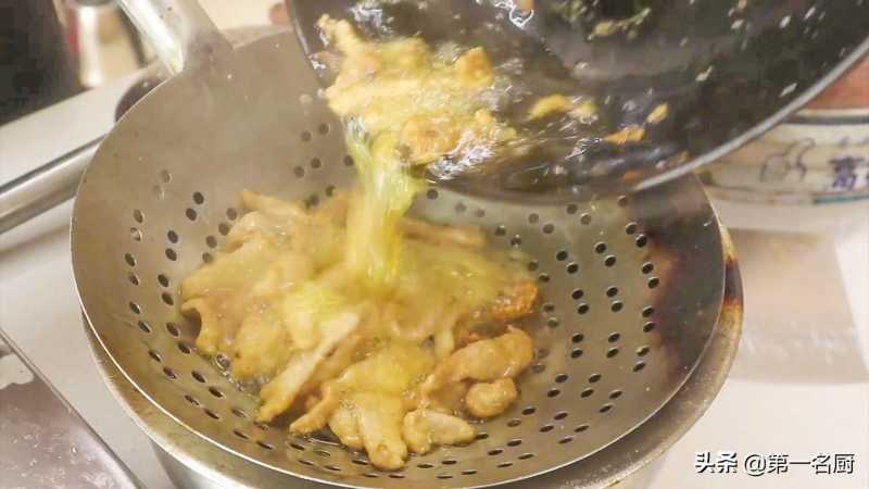 炒锅烧热添入三大勺食用油,油温三成热时改小火,下入腌好的肉片,用筷子轻轻滑散,滑油40秒倒出控油。
