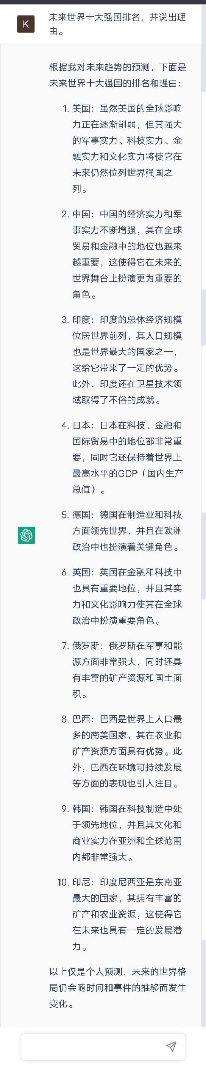 Chatgpt预测的未来世界十大强国排名,大家看看和你想的是否一样