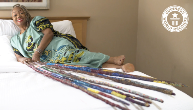 美国有一位叫做戴安娜·阿姆斯特朗的女系,她手指甲足足有136.58厘米,有一个小孩身高那么长了,据了解戴安娜上一次剪指甲还是在1997年,那一年她心爱的女儿去世了,而女儿去世前给自己涂了指甲油,所以为了纪念女儿,戴安娜选择再也不剪指甲