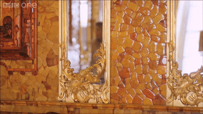 像是琥珀屋,它是由普鲁士国王送给俄罗斯彼得大帝的豪华礼物,光是墙面镶嵌的琥珀与珍宝就有6吨多重,算是金碧辉煌中的金碧辉煌。目前能看到的也只有复原品了,只不过复原工程就干了25年,花了上千万美元。