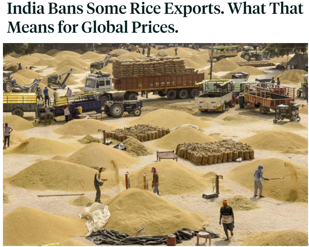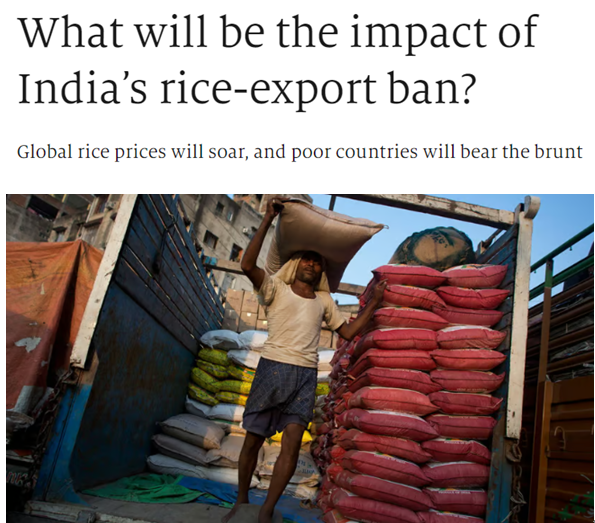 当地时间20日,印度政府已经宣布,为保障国内市场供应,印度将禁止除蒸谷米和印度香米外的大米出口,即日生效。印度消费者事务、食品和公共分配部当天发布公告说,强季风降雨对农作物造成严重损害,在大米零售价格一个月内上涨3%后,政府决定实施限制大米出口的措施。