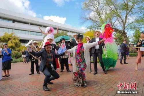 资料图:2017年11月10日,全球闻名的“墨尔本赛马节”吸引不少中国游客。图为一对来自中国的夫妇伴着乐队的音乐和歌声,挥舞着中澳两国国旗翩翩起舞。中新社记者陶社兰摄