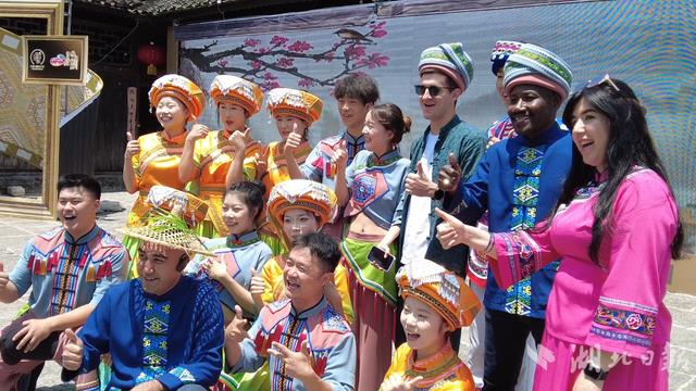 外媒记者身着土家族民族服饰与宣恩彭家寨工作人员合影留念。(湖北日报全媒记者 沈早慧/摄)