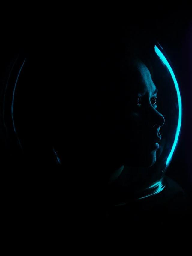 还有创作者用手机拍起科幻大片,一束蓝光打在主体人物的头盔上,静谧幽暗,画面非常简洁,但布满了人类探索未知的紧张感。不安和希望并存,与许多人看待新兴科技的态度一样。