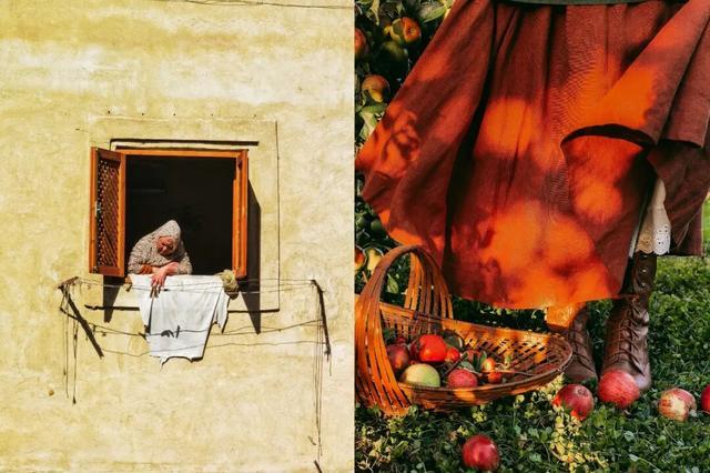 开罗马穆鲁克沙漠地区的一位倚在窗边低头沉思的居民,还有在英国秋天的苹果园,把镜头从丰收枝头移到脚下草地,红裙与红果、草地与皮靴,又是一幅别具韵味的秋日美景。