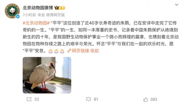 今天,北京动物园在微博发文,称,“平平”的一生如同一本厚重的史书,记录着中国朱鹮保护从绝境到新生的四十年,是我国野生动物保护事业一个微小而辉煌的篇章,也镌刻着北京动物园在物种存续之路上的艰辛与荣光。怀念“平平”与我们在一起的欢乐时光,愿“平平”安息。