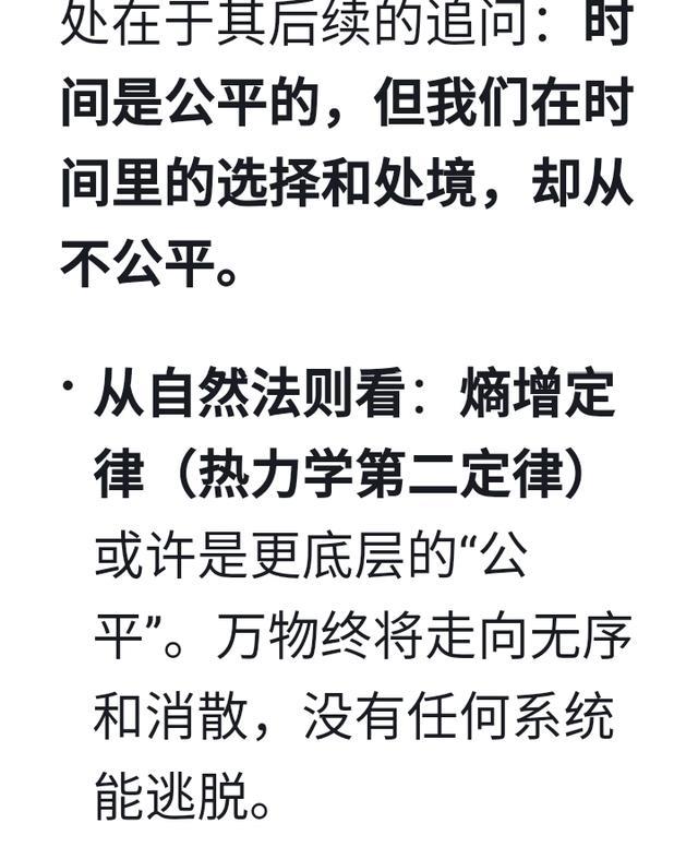 · 从自然法则看:熵增定律(热力学第二定律) 或许是更底层的“公平”。万物终将走向无序和消散,没有任何系统能逃脱。