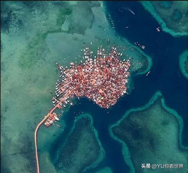 从空中俯瞰,这座岛就像一块被房屋完全覆盖的海上礁石,没有街道,只有错综复杂的狭窄小道,木头和铁皮搭建的房屋紧紧相连,形成了一块密不透风的 “海上蜂窝”。