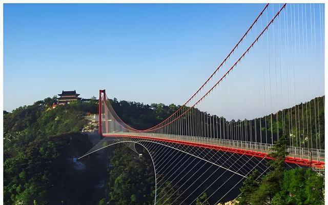 第五站,费县沂蒙山天蒙景区的人行悬索桥,世界最大跨度人行索桥。全长505.5米,主跨420米,桥面离谷底143米,无桥墩横跨两座山。走在上面像漫步云端,360度看群山,惊险又壮观,景区门票约80元,喜欢刺激的朋友一定要体验。