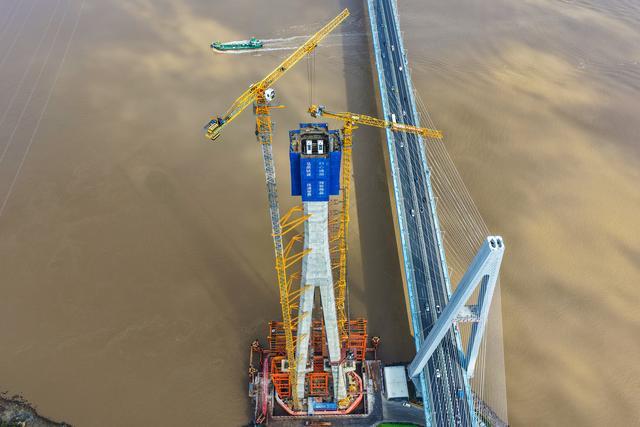 4月15日,舟山海域桃夭门水道,工人们正在这个高度上绑钢筋、浇混凝土——相当于把一栋67层的摩天大楼竖在海面上。
