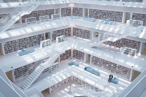 这座9层的公共图书馆于2011年对外开放,由建筑师李恩永设计。建筑通体呈白色(夜晚打上蓝色灯光),令人称叹,其立方体结构醒目,内部空旷,颇具特色。该馆是斯图加特市的文化中心,让人感到宽敞亮堂,四个方向皆有入口,人们既可以借书,也可以借艺术品。
