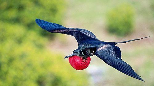 具极细长的翅及长而深的叉形尾,翅展长可达2.3米。虽然它们体重轻,但是翅膀大呀,飞行时速度可达418公里每小时,飞离自己的巢穴最远可达4000公里。它们脖颈上那么红色的像大红气球的东西,名字叫做喉囊。
