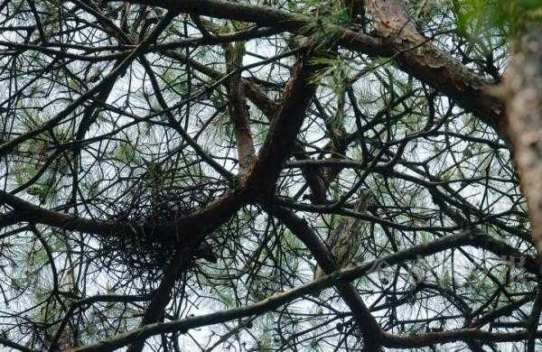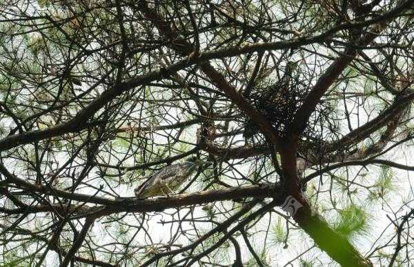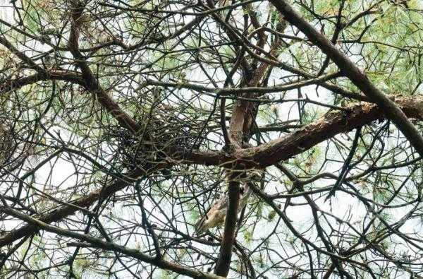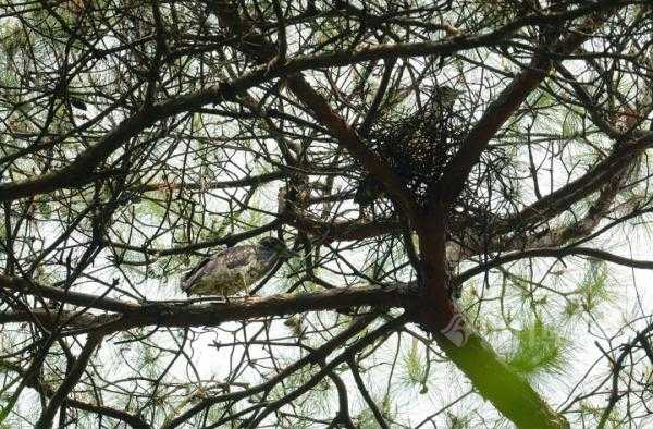 当天下午,记者跟随柳州市观鸟协会副秘书长莫国巍来到这片松树林。经他指点,看到一棵20多米高的松树上,有一个鸟巢,一只伸长脖子的鸟正趴在窝里,另一只则警惕地站在窝旁的树枝上。