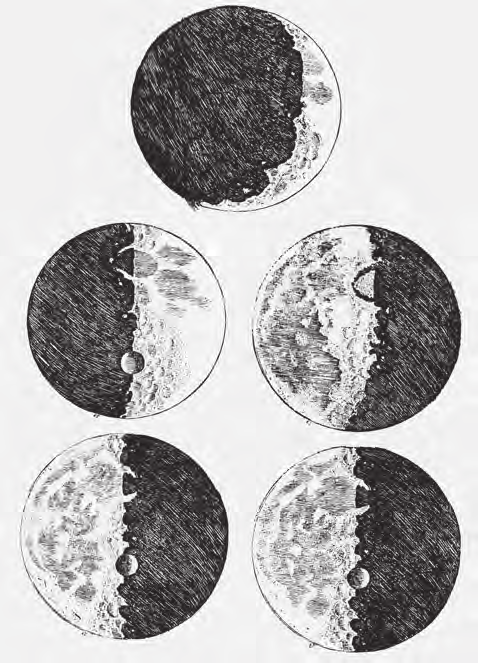 图4 伽利略手绘的月相图,望远镜下的月亮并不是一个完美的球体