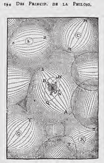 笛卡尔既不承认虚空,也不承认原子,他的宇宙被物质所充满,其中的物质是无限可分的。在《哲学原理》(1644)中,笛卡尔规定了宇宙运行所服从的最高定律,即总物质量和速度的乘积保持恒定,类似于今天的动量守恒定律。他还加入了三条辅助性的运动定律,用以描述自然事件的进程:第一定律排除了一切可能的自发运动,第二定律即惯性定律,第三定律刻画了物体碰撞之后的运动。