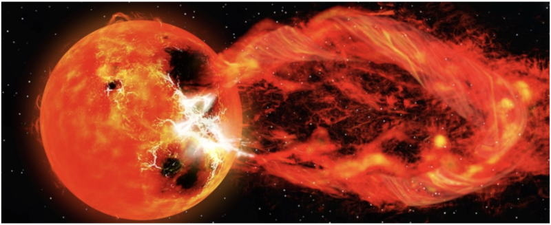 喷发的速度至少为每秒990公里(615英里),远远超过了这颗恒星347公里/秒的逃逸速度。它发展成日冕物质抛射,携带数万亿吨物质进入太空。