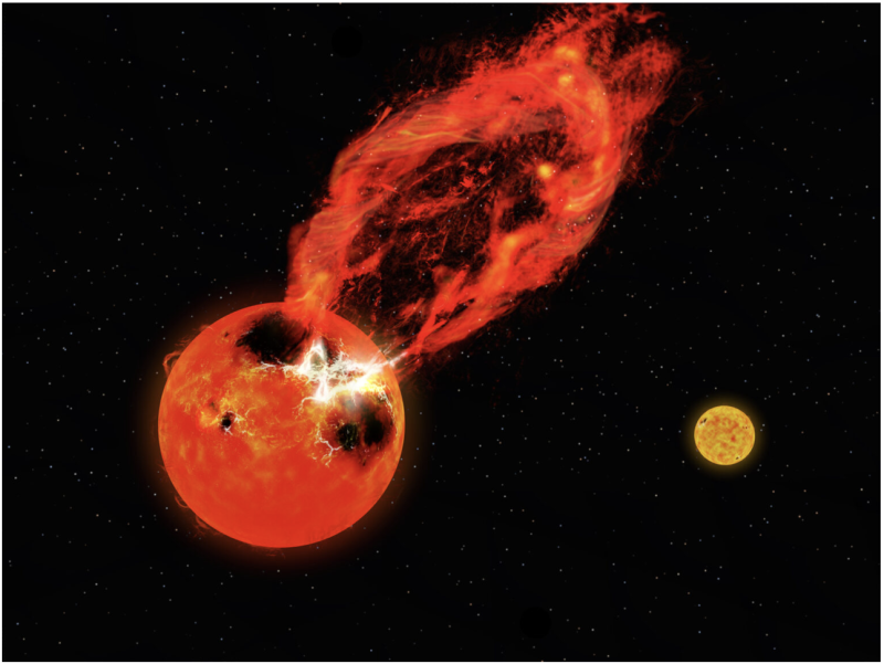 由日本京都大学的井上顺(Shun Inoue)领导的一组天文学家,使用3.8米(12.5英尺)的 Seimei 望远镜和凌日系外行星测量卫星(TESS)监测了这个双星系统。他们成功地捕捉到了一个超级耀斑,它始于一个巨大的高速日珥。这是恒星最强烈的喷发之一。