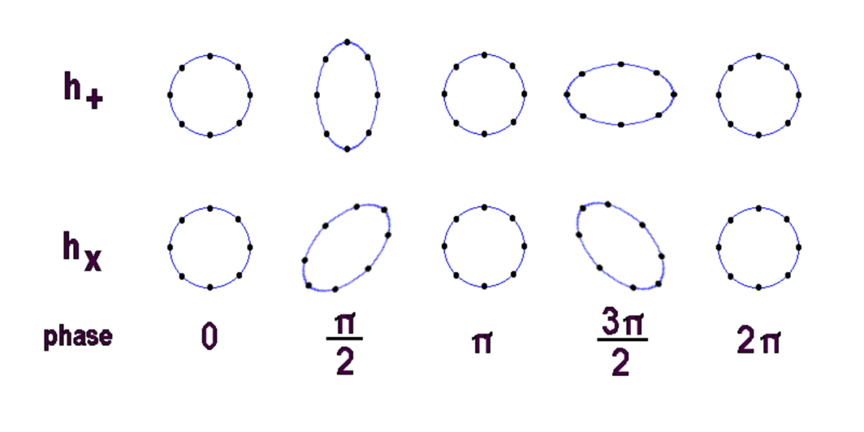引力波是横波,它有两种偏振模式:+模式和x模式。图中黑色点代表自由的质点。