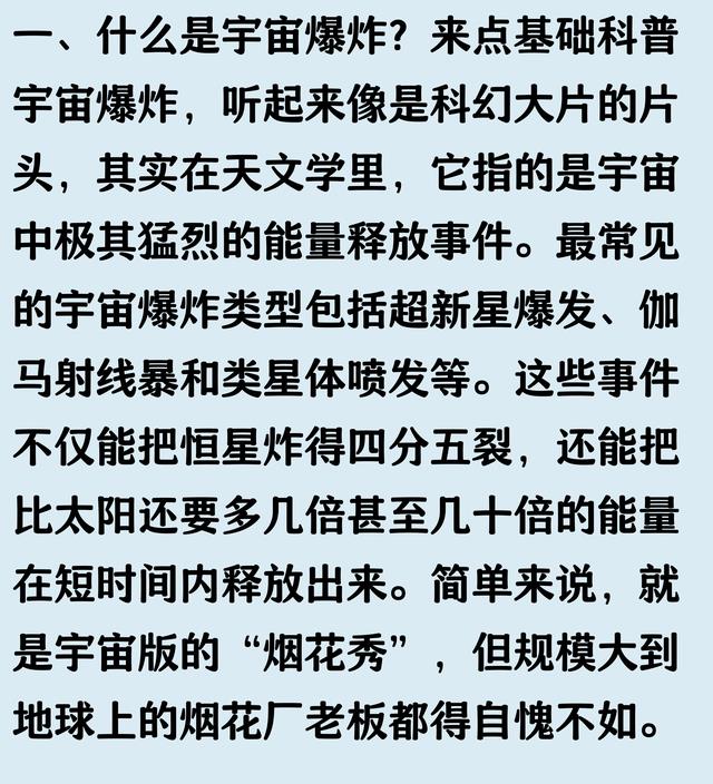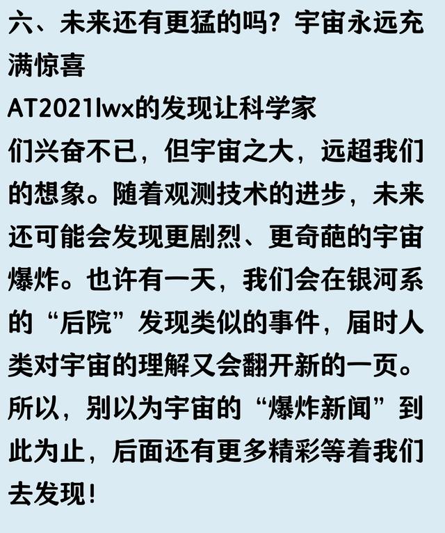 你能想象吗?宇宙中竟然发生了一场比以往任何一次都猛烈的爆炸!最近,天文学家们捕捉到了有史以来最剧烈的宇宙爆炸,能量巨大到让人难以置信。每次听到这样的消息,都觉得宇宙太神秘、太不可思议了。或许,这次爆炸会让我们对宇宙的认识再次被刷新!