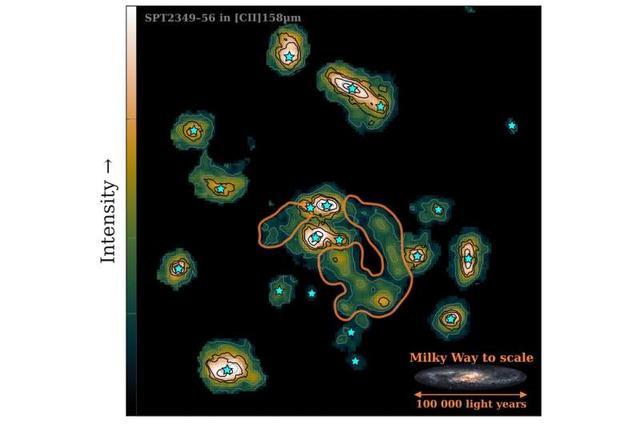 ALMA望远镜在亚毫米波段捕捉到了四颗紧密纠缠的星系。它们正在以极其疯狂的效率制造恒星:平均每40分钟就诞生一颗。作为对比,我们所在的银河系目前每年只能产出3到4颗恒星。这四颗星系以每秒300公里的速度相互撕扯,抛射出巨大的潮汐臂,跨度远超银河系。 这些气体流在冲击波作用下被加热,电离碳原子(CII)在158微米波段发出强烈辐射,亮度被放大了十倍,如同一串发光的珍珠项链环绕着核心。