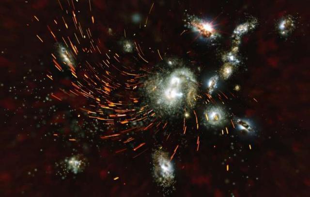 图释:原星系团SPT2349-56的艺术家图展示了不同形状和大小的相互作用星系,以及被潮汐力撕裂并加热的橙色气体。图片来源:N.苏尔泽瑙尔,MPIfR