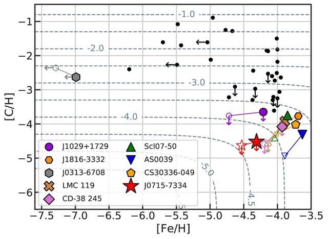 不仅如此,这颗恒星还打破了人们对贫金属星的固有认知,以往发现的低铁恒星大多呈现“贫铁富碳”的特征,而SDSS J0715-7334不仅铁含量极致匮乏,碳元素也异常稀少,这种独特的化学组成,为推断它的形成时间和形成环境提供了关键线索。