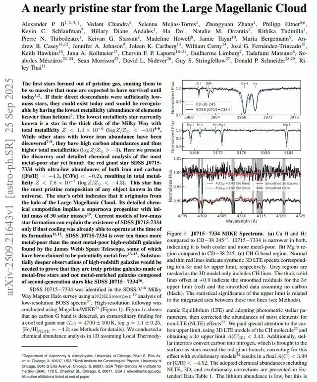 从宇宙大爆炸的混沌初开,到第一颗恒星的点亮,再到如今银河系的璀璨星河,恒星的演化始终是宇宙历史中最动人的篇章。SDSS J0715-7334这颗距地球8万光年的红巨星,如同一位穿越了百亿年时光的“见证者”,它以极致的贫金属特征,向人类诉说着宇宙早期的故事。