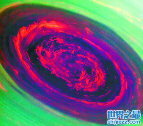 土星南极上空32公里处有一个巨大的漩涡,其面积相当于地球直径的三分之二。漩涡就像一个神秘的黑眼睛结构。虽然这场风暴看起来有点像典型的飓风,但它的特征一点也不像飓风。风暴眼固定在土星的南极。在直径1600米的暴风云中,风速高达每小时1800公里。