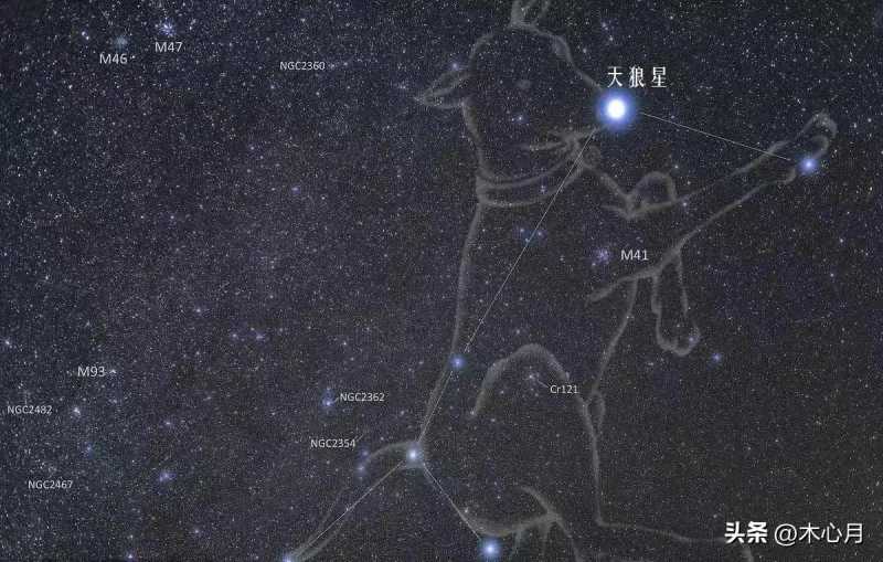 【天狼星】(Sirius、意为烧焦),即大犬座 α 星。天狼星在夜空中亮度全天排名第一,视星等为-1.46等,是我们能看到的除太阳外全天最亮的恒星,距离地球约为 8.6 光年。天狼星是由A、B两星组成的目视双星。A星是全天第1亮星,属于主星序的蓝矮星,半径为太阳的1.71倍,比太阳亮23倍。B星一般称天狼伴星,是白矮星,质量比太阳稍大,而半径比地球还小。天狼星与大犬座其它一些比较亮的星构成了一只犬的轮廓,位于大犬的嘴巴上。