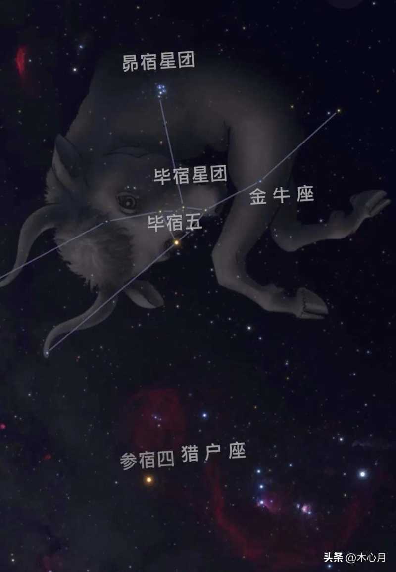 【毕宿五】毕宿五,即金牛座α,被称为金牛的眼睛,是颗红巨星,为全天第14亮星,平均视星等0.85等。毕宿五的直径约为6280万公里,是太阳直径的45.1倍,与太阳的距离为68光年,质量比太阳大16%左右,亮度是太阳光度的439倍。