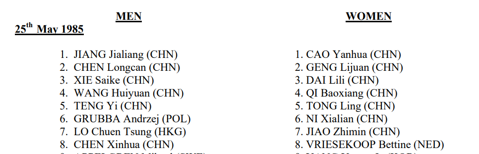 囊括排名前六不易,包揽排名前七更难,对于习惯创造奇迹的国乒来说,居然还做到了!国际乒联1985年5月公布的世界排名榜,女单前七名无一例外地来自国乒,这七位国手是:曹燕华、耿丽娟、戴丽丽、齐宝香、童玲、倪夏莲、焦志敏。世界排名在一定程度上体现了一名队员和一支队伍的实力,当年四五月间举行的第38届世乒赛,女单八强中国独占七席。