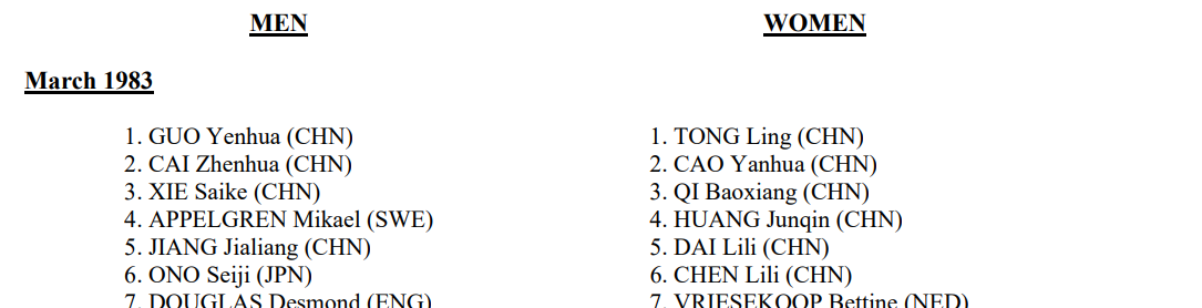 引以为豪的是,以往中国女乒曾创造过席卷排名榜前六的传奇,1983年3月公布的世界排名榜,国手童玲、曹燕华、齐宝香、黄俊群、戴丽丽、陈莉莉位居前六。国际乒联于1928年设立世界排名榜,1983年3月前从未有同一支代表队的选手包揽排名榜前五,国球手居然创造了席卷前六的奇迹,了不起!