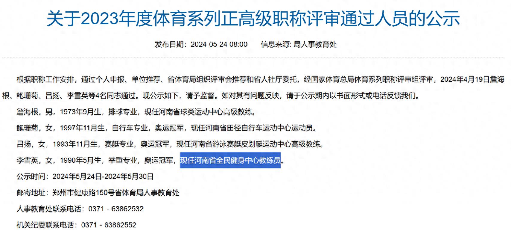 公示显示:根据职称工作安排,通过个人申报、单位推荐、省体育局组织评审会推荐和省人社厅委托,经国家体育总局体育系列职称评审组评审,2024年4月19日詹海根、鲍珊菊、吕扬、李雪英等4名同志通过。公示时间:2024年5月24日至5月30日。