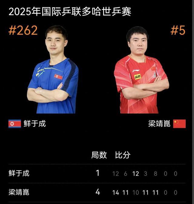 5月17日,多哈世乒赛首日焦点战,国乒主力梁靖崑迎战朝鲜“神秘之师”鲜于成。这场被外界视为“摸底战”的较量,最终梁靖崑以4:1力克对手,其中首局0-2落后、14-12逆转的惊险剧情,不仅展现了“大胖”的战术智慧,更印证了他“外战战神”的硬核实力。
