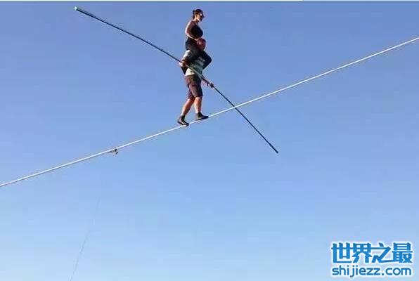 高空走钢丝是一种要求参与者在高空毫无辅助器械的帮助下完成在钢丝上行走的运动,是一款需要兼具智慧与勇气的极限运动项目,而在正常高度走钢丝就已经很困难了,最厉害的还要数升起两个热气球来走钢丝,那也不是一般人可以进行的运动。