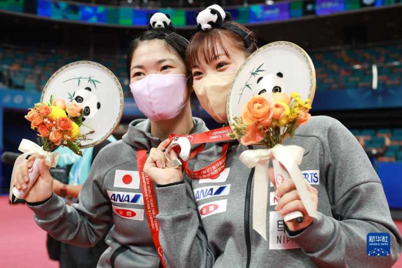 10月8日,日本队选手长崎美柚(右)、木原美悠头戴熊猫头饰在颁奖仪式后合影留念。新华社记者 刘续 摄