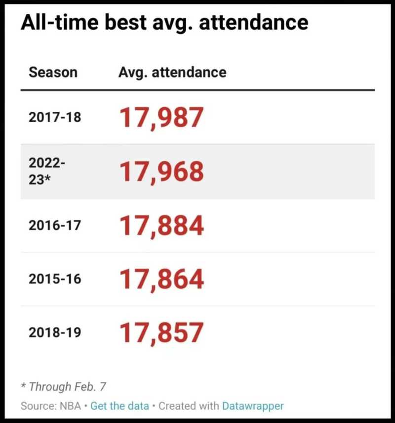 根据Sport Business Journal调查显示,截止到今年2月7日时,NBA打完的820场常规赛的场均上座达到了17,968次,与2017/18赛季疫情前所创下的17,987次历史最高纪录相差无几;而这其中502场都是售罄的状态,而在去年同时期的这个数据则仅为176场。