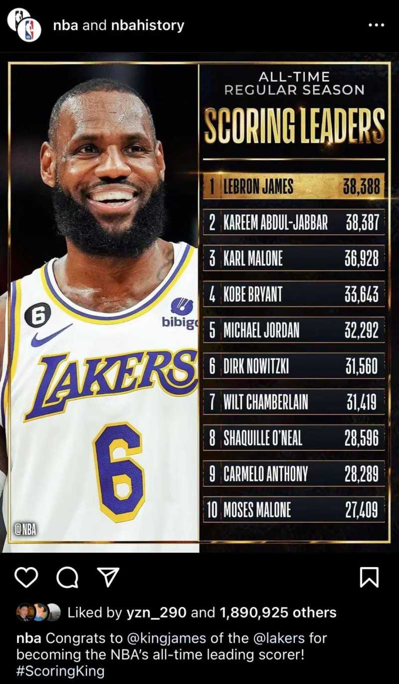詹姆斯破纪录时,NBA官方IG的推送收获近200万的点赞