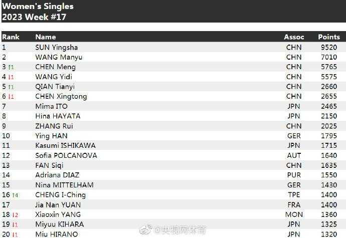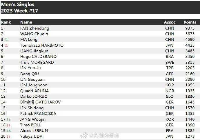 4月25日,国际乒联更新了2023年第17周的世界排名。