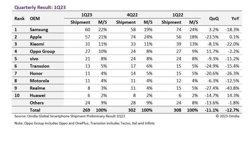 因为Omdia给出了2023年第一季度全球智能手机前十的排名,根据Omdia的数据过去的一季度全球智能手机同比下滑为12.7%,环比下滑为11.1%。下面来看下进入前十的品牌都有谁: