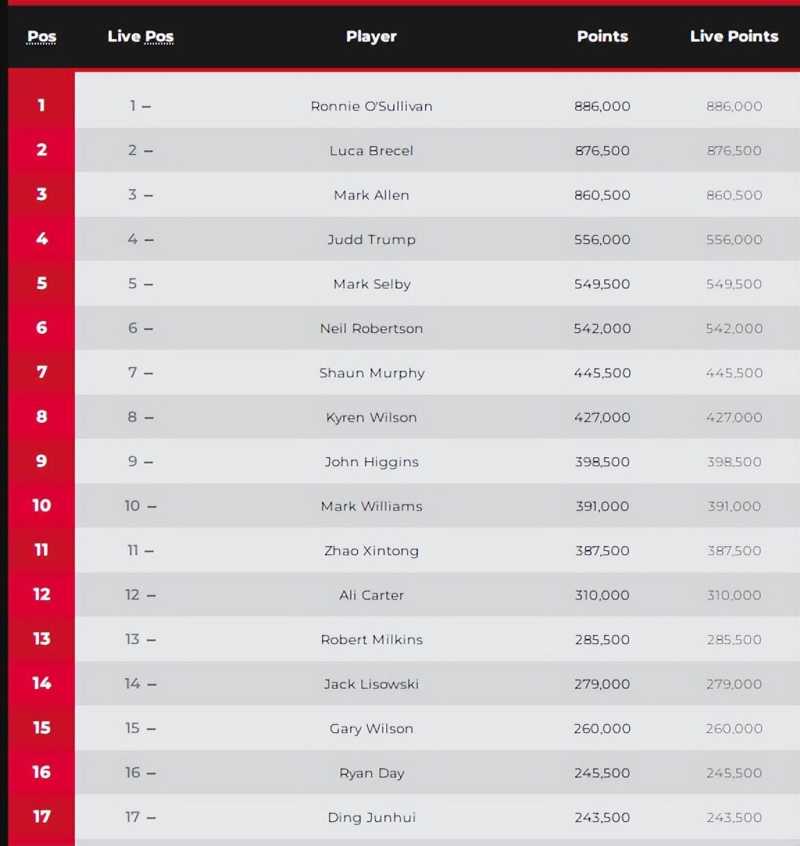 获得亚军的塞尔比排在第五,奖金积分为549,500(约合人民币4739111元)英镑。“火箭”奥沙利文依旧高居世界第一,奖金积分为为886,000(约合人民币7641223元)英镑。