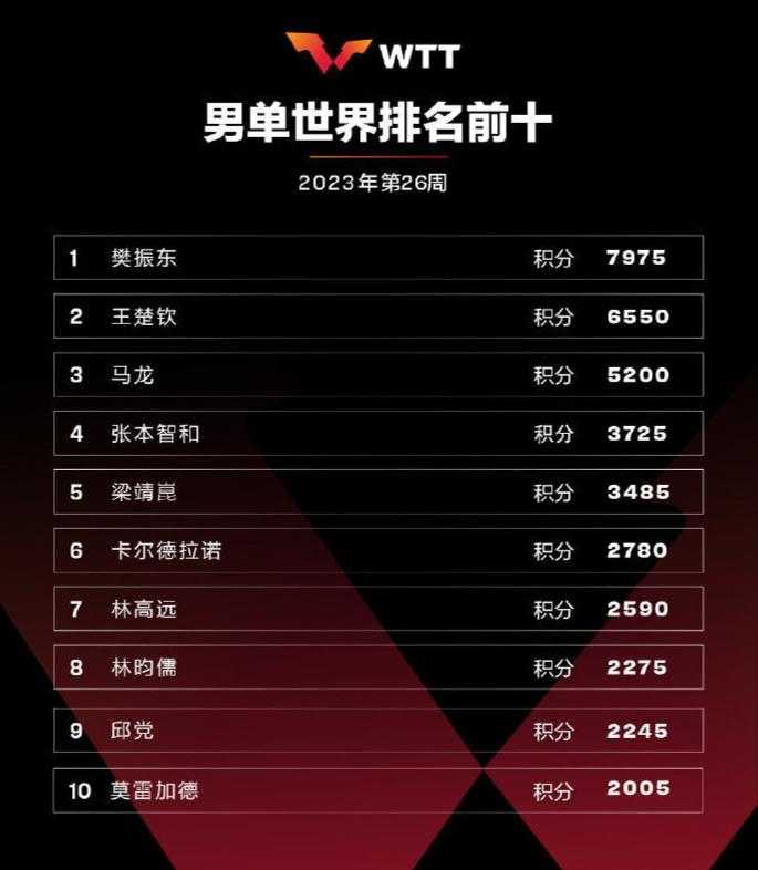 - 国际乒联男单世界排名:王楚钦、林诗栋前二,梁靖崑第七