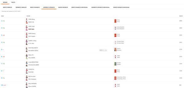 男双方面,韩国组合张禹珍/林钟勋升至第一,樊振东/王楚钦40分之差屈居第二,林高远/林诗栋上升6位来到第六,林诗栋/陈垣宇上升6位来到第九。