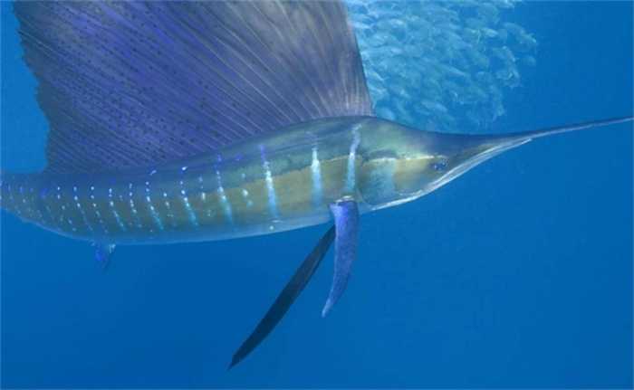 之所以旗鱼有名字是因为在他的背部有一个十分大的鱼鳍,看起来就像是举着一个旗子一样,整体来看的话,身体就像是一把宝剑,并且在他的头部有着比较长的尖锐部分就像是剑鱼一样,这两个特征也是让他们在水下的游动速度变得更快,可以更好的去破开水流,并且可以很好的控制他们在水下的方向。他们的肌肉非常的发达,并且提醒在海洋当中也不算很小。