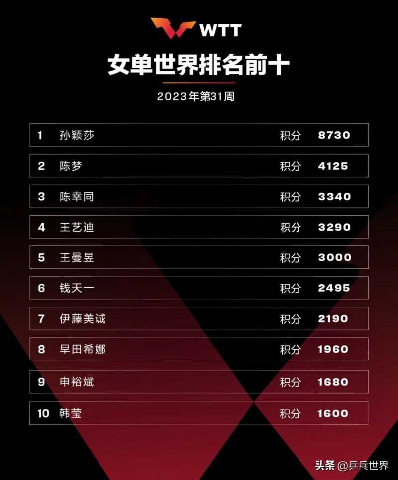 女单前十位同样没有变动,中国队球员孙颖莎、陈梦、陈幸同、王艺迪、王曼昱、钱天一位列前六。