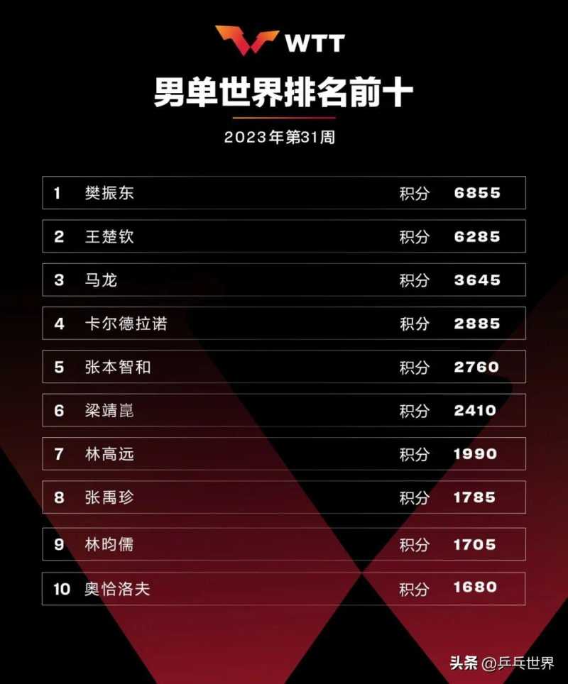 - 最新世界排名公布,王楚钦、孙颖莎单打排名第一