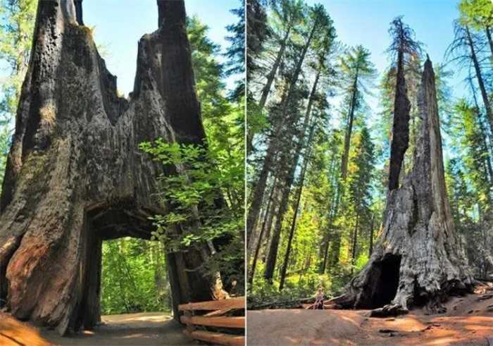 加利福尼亚州的第一条穿越树木,是在优胜美地国家公园一个死去的巨型红杉上雕刻而成的。这棵树被闪电击中,从距离地面27米的地方拦腰折断,并且被剥皮,尽管这样,它也继续活了很多年才死去。但它于1875年被雕刻成一个穿越隧道,以促进旅游业。虽然现在开车穿越它已经被禁止了,但这棵树仍然存在,并吸引着大量的游客。