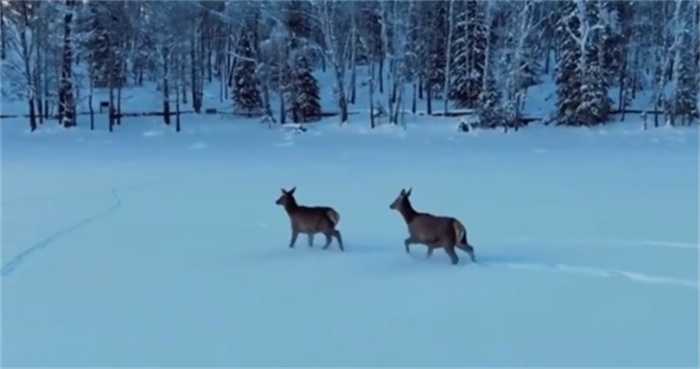 将小鹿形容成精灵或许并不过分,因为鹿被视为祥瑞之兽的象征,这一寓意源远流长。在汉代的《春秋运斗枢》中,就曾有记载:“瑶光散为鹿。”在这雪雾覆盖的世界中,小鹿们自由地游走,为这个景象增添了一抹幽深神秘的色彩。小鹿轻轻地踏过湖水,跨出水面,脚步印刻在皑皑白雪中,从湖畔跑向丛林深处。在进入树林之前,有一只小鹿停下了步伐,转过头回望。它那耸立的大耳朵和屁股上的心形白斑形成了一幅别样的画面。透过这个白斑,可以辨认出小鹿的品种,这就是白臀鹿,我国特有的一种鹿。