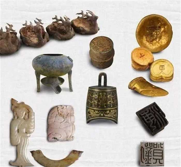 成套出土的有编钟、编磬、琴、瑟、排箫、伎乐俑;竹简、木牍以及有文字的漆笥、耳杯等数以千计;五铢钱10余吨近400万枚;青铜雁鱼灯、青铜火锅上的花纹惟妙惟肖;青铜镜上镶嵌着玛瑙、绿松石和宝石等等,都是汉代考古文物珍品。车马坑出土了实用高等级马车5辆,马匹20匹,错金银装饰的精美铜车马器3000余件。